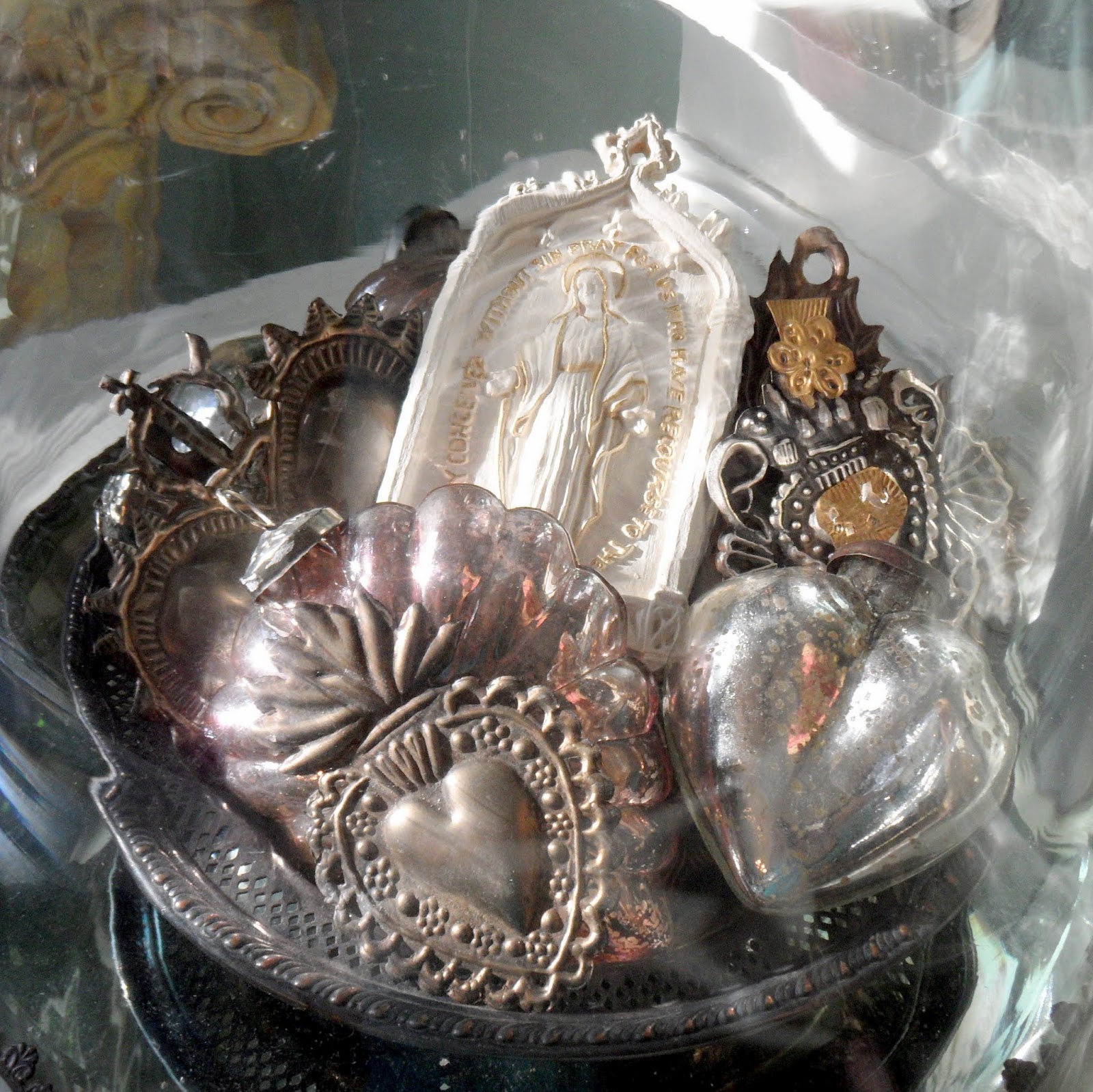 Recently, several nationally published magazines featured big antique trends for 2012 and featured religious items! I wanted to share some of my collection I recently changed around in my dining room! If you didn't know I collect mercury glass hearts, pressed tin ex voto hearts, and other religious items including hymnals, altar furniture and fixtures, stained glass, and crucifixes. I've even got some organ pipes!